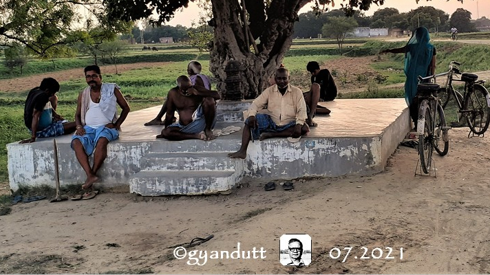 मैंने साइकिल से द्वारिकापुर का गंगा तट छू लिया था। भ्रमण की लौटानी में था। सूर्यास्त होने को था। अभी 10-15 मिनट शेष थे। उतने में तो घर पंहुच ही जाऊंगा – मैंने हिसाब लगा लिया था। इतने में द्वारिकापुर और कोलाहलपुर के बीच पेड़ के नीचे बने चबूतरे पर कई लोग सुस्ताते दिखे। शाम के सिंदूरी नेपथ्य में वह चबूतरा बड़ा आकर्षक दृष्य उपस्थित कर करा था। स्वत: मेरी साइकिल के ब्रेक लग गये।