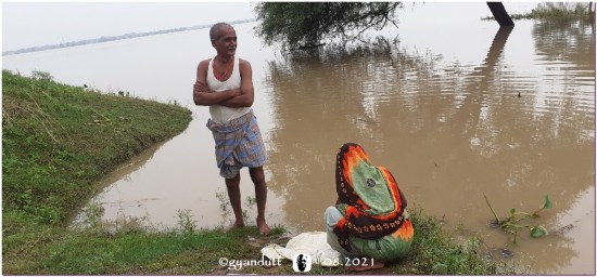 कोलाहलपुर – बांध को लांघ कर पानी गांव की ओर आगे बढ़ गया है। बांध के बचे एक हिस्से पर तीन चार आदमी दिख रहे हैं मछली पकड़ने के लिये बैठे
