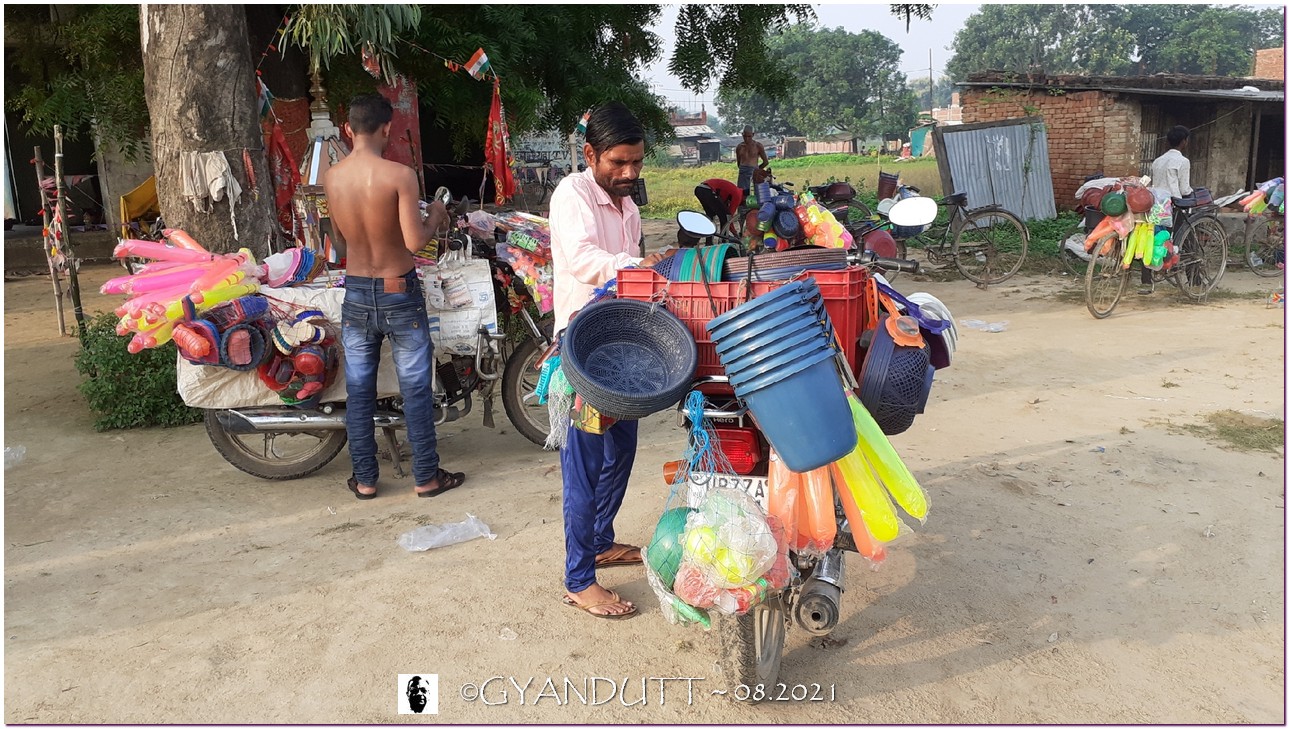 इन लोगों के पास गांवदेहात में बिकने वाला सस्ते, रीसाइकिल्ड प्लास्टिक का सामान होता है। जिसका दाम कम होता है और मोल-भाव की सम्भावना ज्यादा। मेरे ख्याल से ये सब बेचने और बार्गेन करने की विधा में पारंगत होंगे; या फिर दिन भर घूम घूम कर बेचना वह सिखा देता होगा। सामुहिकता में वह लर्निंग सहज ही आ जाती होगी।