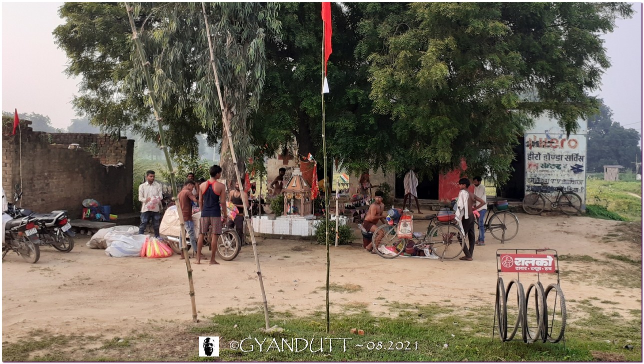 कटका पड़ाव पर एक चबूतरे पर बने छोटे से मंदिर के पास मुझे बहुत गतिविधि दिखी। वह जगह एक मैदान थी। एक पेड़ के नीचे चबूतरे पर मंदिर था और पीछे कुछ कमरे या दालान जैसी इमारत। ऐसा लगा कि वहां कल रात में कोई हाट बाजार लगा रहा हो और सवेरे दुकानदार अपना अपना सामान समेट कर जाने वाले हों। सवेरे साइकिल ले कर निकलने में मेरा पहला ध्येय होता है शरीर का व्यायाम। और दूसरा (ज्यादा महत्वपूर्ण) होता है अपने कौतूहल पर ध्यान देना और जिज्ञासा के शमन के लिये आऊट ऑफ द वे जा कर चीजों को ध्यान से देखना, लोगों से बोलना बतियाना, अपने नोट्स लेना। उसके लिये मैं वहां रुका।