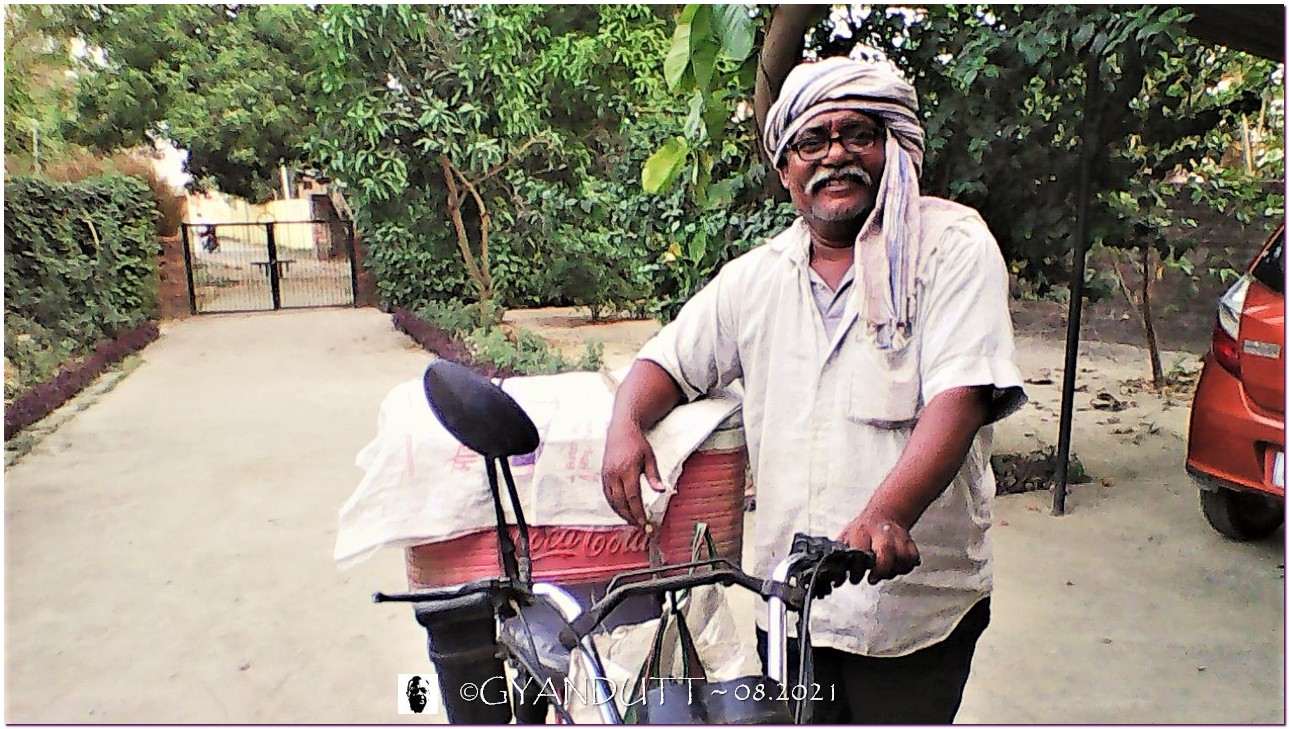 कन्हैयालाल, फेरीवाला। ” मैंने कन्हैयालाल से एक पोज देने को कहा। वे अपना लोअर घुटनो तक चढ़ाये हुये थे। तुरंत लोअर को पूरा पैरों पर फैलाया और अटेंशन की मुद्रा में चित्र खिंचवाया।