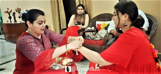 लोग राखी बंधवा कर, खा-पी कर काम पर निकल लिये हैं। मेरी पत्नीजी के दो भाई लेट आये हैं। चांव चांव मची है। उनके लिये लाई राखी इधर उधर हो गयी है। पत्नीजी बताती हैं कि उनके (दिवंगत) पिताजी कह गये थे कि बेटा राखी का कोई मोल नहीं होता है। इसलिये भाई लोगों ने लिफाफा देने की परम्परा ही नहीं रखी। पर वे हैं खूब प्रसन्न। कई दिनों ने आज के आयोजन की तैयारी कर रही थीं। कमरे के बाहर दालान में निकल कर उन सब की उत्फुल्लता का अनुभव कर आता हूं मैं बीच बीच में।