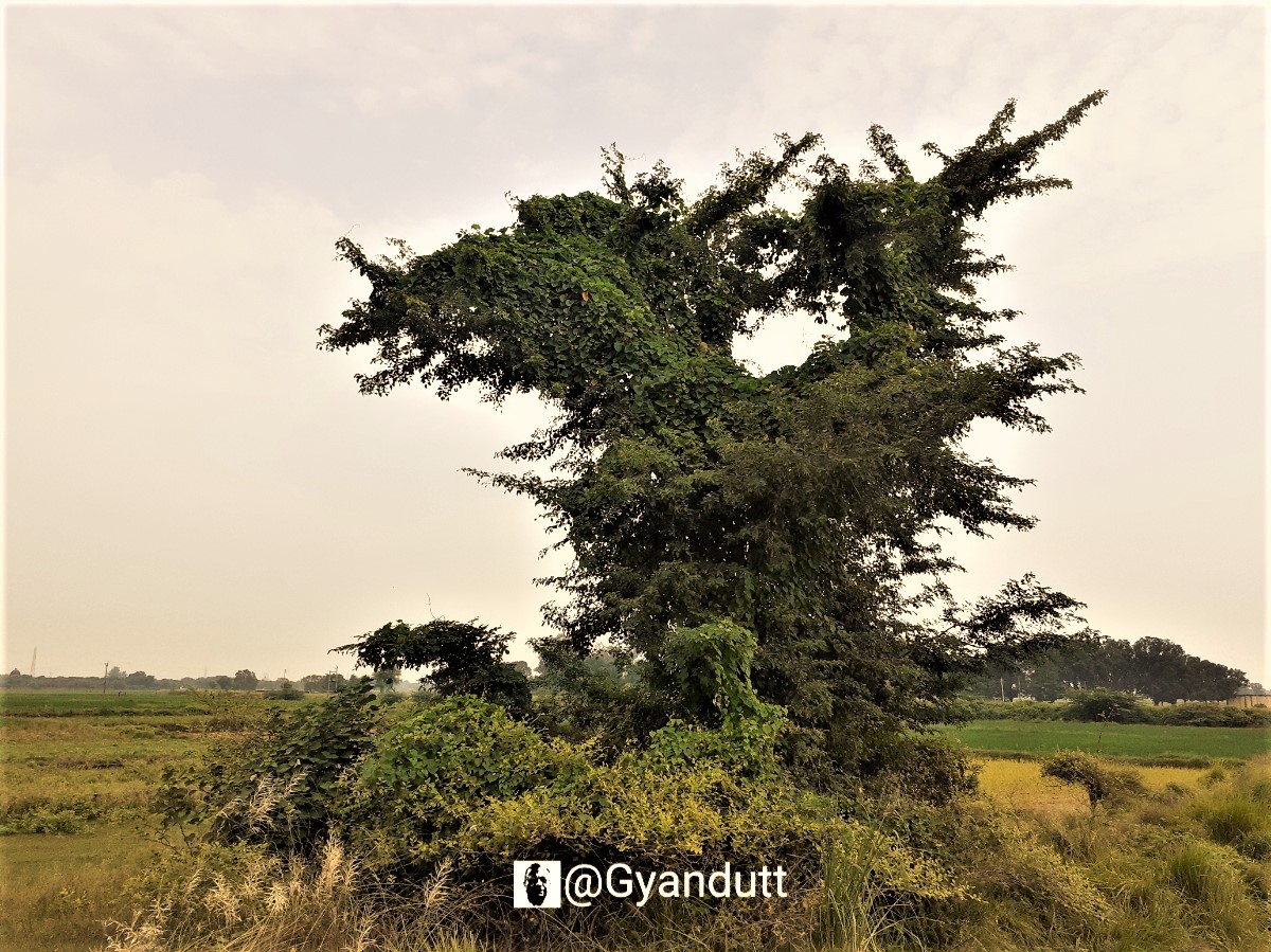 उस अजीबोगरीब से दिखते (शायद शीशम के) पेड़ के पास रुकता हूं। लतायें उसपर इस तरह चढ़ गयी हैं कि अजीब सी आकृति बन गयी है। लगता है जैसे विशालकाय दैत्य को रस्सियों में जकड़ दिया गया हो। या उस पर हजारों सर्प लिपट गये हों!