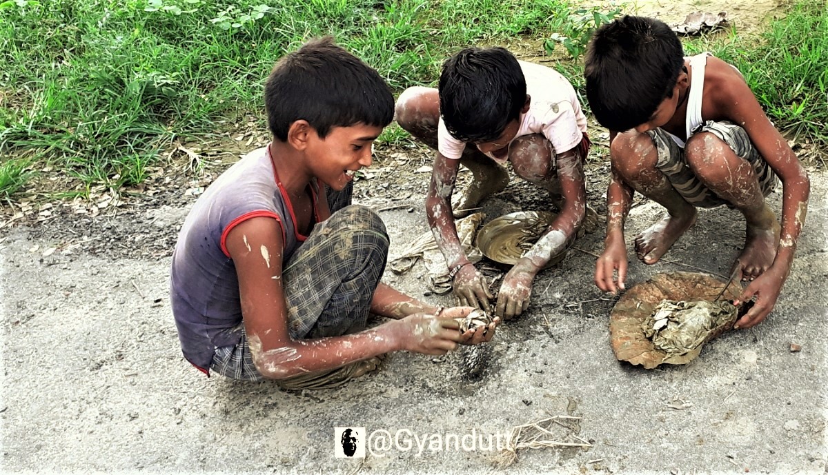 वे बच्चे खूब खुश नजर आते थे। मैंने पानी को मेड़ बना कर रोकने और उसके पानी को उलीच कर उसमें से बची मछलियाँ पकड़ने का काम करते बच्चों (और बड़ों को भी) यहां गांवदेहात में बहुत देखा है। ताल में, नाले में या गंगा नदी में – कहीं भी। उन बच्चों के हाथ पैर, यहाँ तक की मुंह भी कीचड़ से सने थे। पर उसकी फिक्र उन्हें कहां! वे तो अपने ज्वाइण्ट वेंचर में अपनी प्रोडक्टिविटी का आनंद ले रहे थे। आधा घण्टा की मेहनत का आनंद। आज तीनों के घर में हाई प्रोटीन डाइट का इंतजाम हो गया। माई बाबू पढ़ने के लिये नहींं कहेंगे; मछली के लिये जरूर आसीसेंगे! :lol: