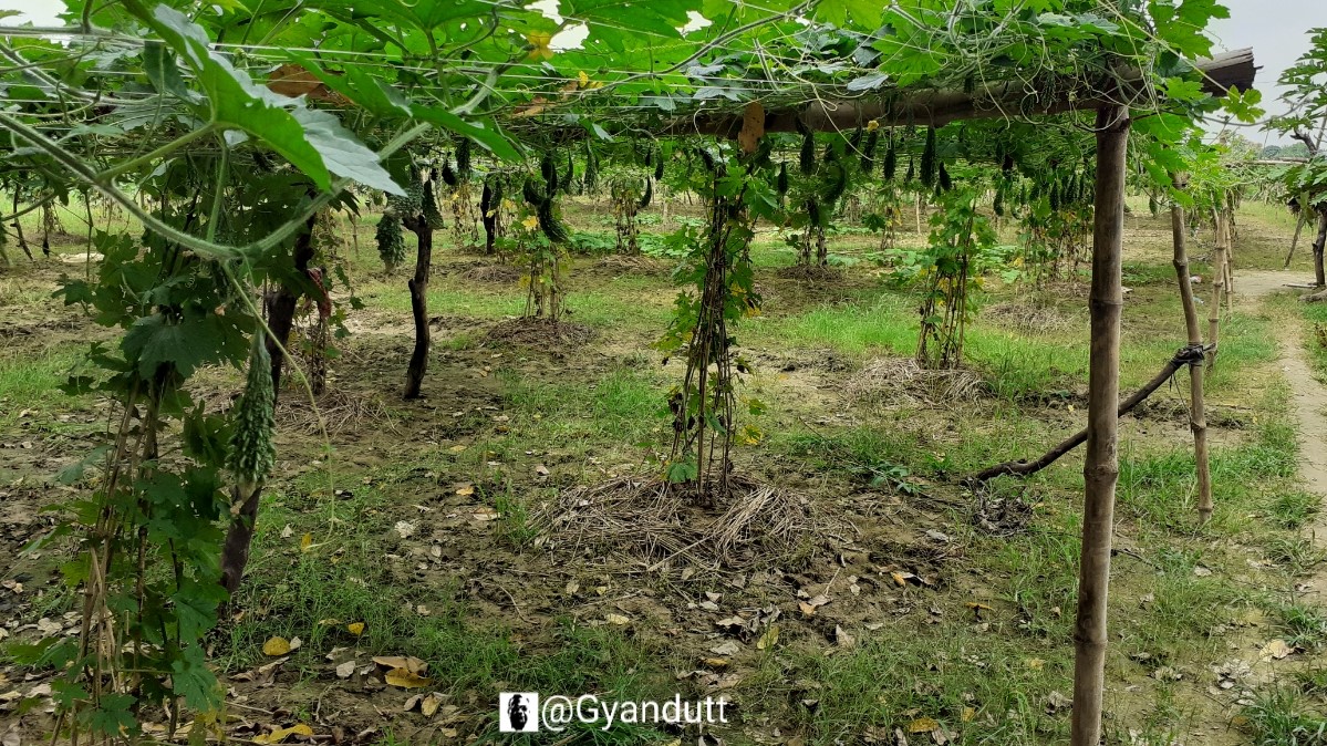 बांस और अन्य लकड़ी जमीन में गाड़ कर बल्लियों के प्रयोग से धरती से करीब पांच छ फुट ऊपर एक स्तर बनाया गया था खेत के बड़े भाग में। उसपर करेले की बेलें बिछी हुई थीं।