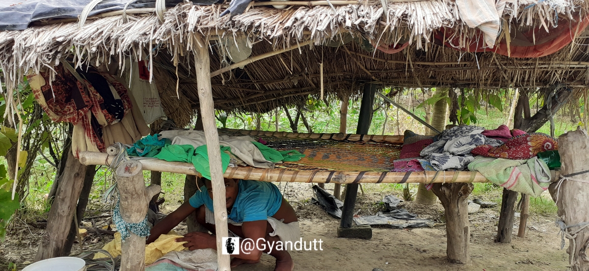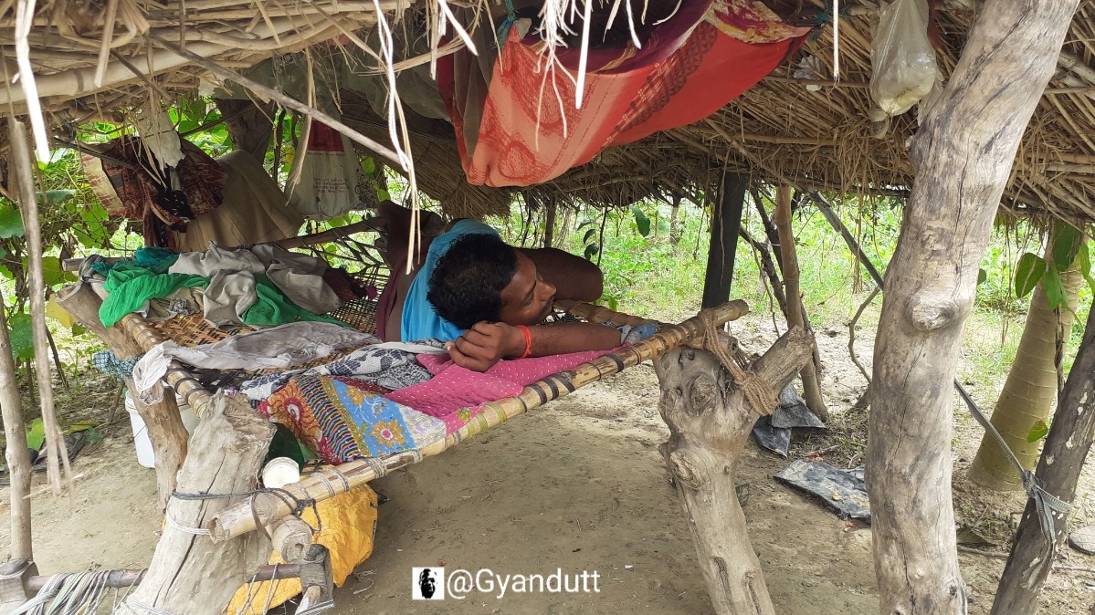 दिन का समय था। करीब साढ़े इग्यारह बजे। धूप टनटना रही थी। पर बेलोंंके कारण वहां ठण्डक थी। एक रखवाला मड़ई में बने मचान पर सो रहा था।