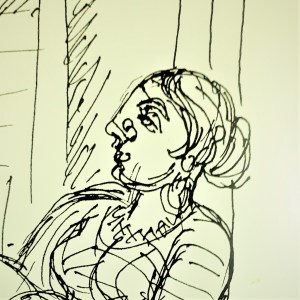 घर के बाहर दीवार से उंठगी बैठी महिला। स्केच आदरणीय अमृतलाल वेगड़