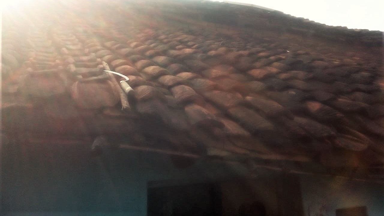 खपरैल वाले एक मकान की छत। उसपर रखा हंसिया देखिये।