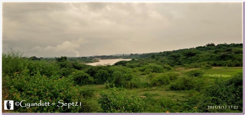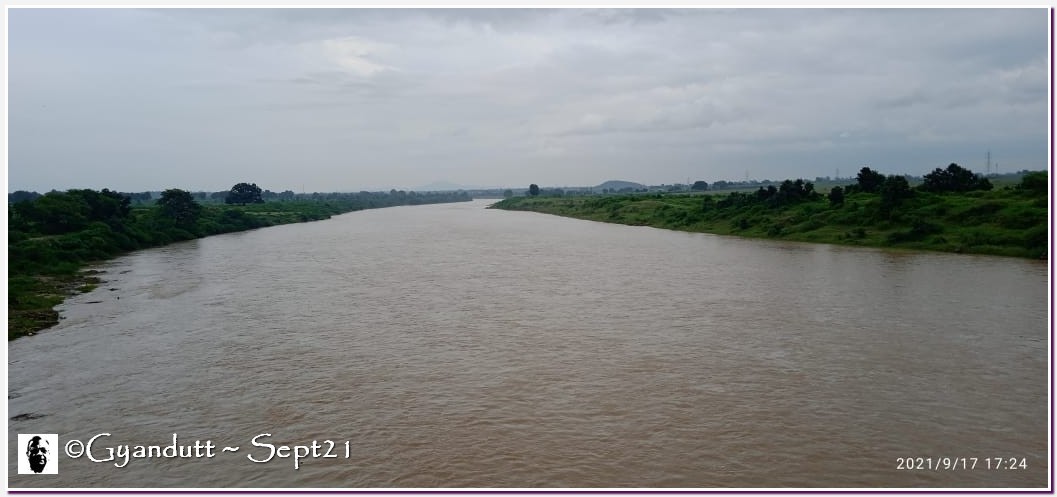 प्रेमसागर जी को आगे सोन नदी मिली। उसके कुछ अच्छे चित्र उन्होने भेजे। बेहतर मोबाइल से बेहतर चित्र! मेघाच्छादित आकाश नजर आता है और नीचे अच्छी खासी जलराशि। नीचे जल था, ऊपर जल था! जलमय ही दृश्य था सोन नदी का।
