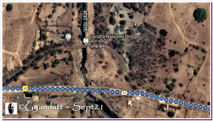 रास्ते में उन्हे सर्फा नदी (गूगल मैप में सर्फा नाला) मिली। किसी भी अलग सी चीज, अलग से दृश्य का चित्र लेने का मैंने उन्हें अनुरोध कर रखा है। उन्होने नदी का नाम बताया, उससे मैंने गूगल मैप पर सर्च किया। मैप के अनुसार उसपर एक पुराना पुल भी है। शायद नये पुल से उस पुराने पुल का चित्र प्रेमसागर जी ने लिया था –