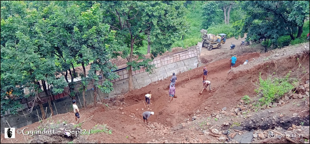 खान साहब भी प्रेमसागर की पैदल यात्रा पर आश्चर्य व्यक्त कर रहे थे। पर अलग थलग जगह पर इतनी ऊंचाई पर, संसाधनों की कमी के बावजूद कोई निजी उद्यमी चौबीस घण्टे काम करवा रहा है – यह भी आश्चर्य है। खान जैसों को देख कर भी एक राष्ट्रीय गर्व का भाव मन में आता है। उनका कार्य, उनका श्रम, उनकी एण्टरप्राइज तो कहीं कोई बोलता-बतियाता-प्रसारित भी नहीं करता। खान ने बताया कि सीमेंट और स्थानीय उपलब्ध पत्थर-गिट्टी-बालू का ही प्रयोग हो रहा है रीटेनिंग वाल बनाने में। बिना खड़े रहने की जगह के वह दीवार बनाना कठिन काम है।