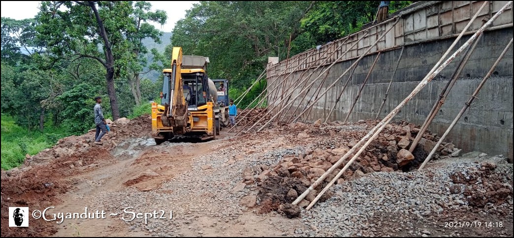 पहड़ की चढ़ाई पर सड़क मार्ग को रिपेयर-रिस्टोर करने वाले कई मजदूर, कई यंत्र और अन्य कर्मी दिखे। एक ठेकेदार खान साहब से प्रेमसागर की बात भी हुई। खानसाहब ने बताया कि वे स्खलन की लगभग चार जगहों पर चौड़ी रीटेनिंग दीवार बनाने का काम कर रहे हैं। दीवार की चौड़ाई पांच फुट की बनाई जा रही है – भूस्खलन की पुख्ता रोक के लिये। उस दीवार में कहीं भी ईंट या मलबा नहीं लगा है। उनका काम चौबीसों घण्टे चल रहा है। काम जल्दी पूरा करने का दबाव है। पर काम के दौरान भी भूस्खलन कई बार हुआ है।