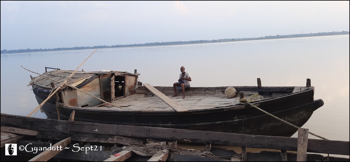 आज शाम पत्नीजी के साथ गंगा घाट पर गया। अपनी नाव पर मनोज सिंह भी एक रम्मा (लोहे की नुकीली रॉड) ले कर लकड़ी निकालने में लगे थे। साथ में एक अन्य व्यक्ति भी काम कर रहा था। मनोज जी ने बताया कि तल्ले की लकड़ी सड़ती नहीं है – वह सदा पानी में रहती है। साइड की लकड़ी जो कभी पानी और कभी हवा के सम्पर्क में आती है, वह खराब हो जाती है। उसे ही बदलना होता है। उसके साथ लगा लोहे का पतरा भी जंग लग जाता है। पतरा भी नया लगता है।