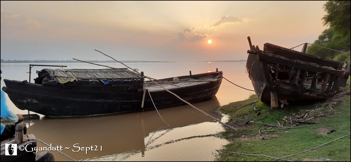 गंगा किनारे का दृश्य हमेशा की तरह सुंदर था। सुबह और शाम के चित्र सुंदर आते भी हैं। अब शाम ढलने में आधा घण्टा ही था। बालू का काम खतम कर नावें किनारे खड़ी हो गयी थीं। पिछले कुछ दिनों में गंगाजी बढ़ी हैं। वह साफ दिख रहा था। एक नाव पर उसका नाविक बैठा सुस्ता रहा था। एक पटरा नाव पर रखा था जो किनारे जमीन पर उतरने के लिये रैम्प की तरह काम आता है। एक अन्य नाव पर बच्चे किनारे पर बैठे सूर्यास्त भी निहार रहे थे और मछली पकड़ने का मनोविनोद भी कर रहे थे। उन्होने बताया कि अभी कोई मछली पकड़ी नहीं है। जो मछली पकड़ने का कंटिया लिये था, उसने बात बात में यह दर्शा दिया कि वह “दक्ष मछली पकड़क” है! पर बाकी दोनो उसकी इस बात का समर्थन करते नहीं दिखे।