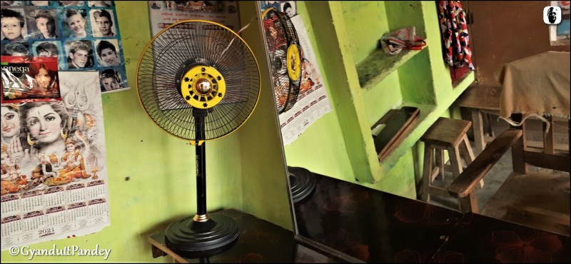 दुकान उसी की थी। पास आ कर उसने अपना नाम बताया – प्रमोद। उसी नाम से दुकान भी है। प्रमोद ने सोलर पैनल के प्रयोग का विवरण दिया। पैनल से तार उसकी दुकान में रखे एक ट्रांजिस्टर की शेप के एक डी.सी. चार्जर-कम-बैटरी सेट में जाते थे। उस डिब्बे से डी.सी. आउटपुट से एक टेबल पंखा, बिजली और मोबाइल चार्जिंग का प्वाइण्ट मिला था। डीसी पंखा अच्छी हवा दे रहा था। प्रमोद ने बताया कि पांच सौ का आया है। प्लास्टिक बॉडी का देसी पंखा था, पर काम अच्छा कर रहा था।