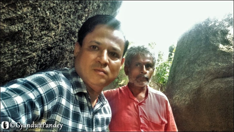 उस चट्टान के सामने बैठने की एक पत्थर की बेंच है। उसपर बैठ कर और उसके आसपास से कई प्रकार से फोटो खींची हैं प्रेमसागर की आशीष जी ने।