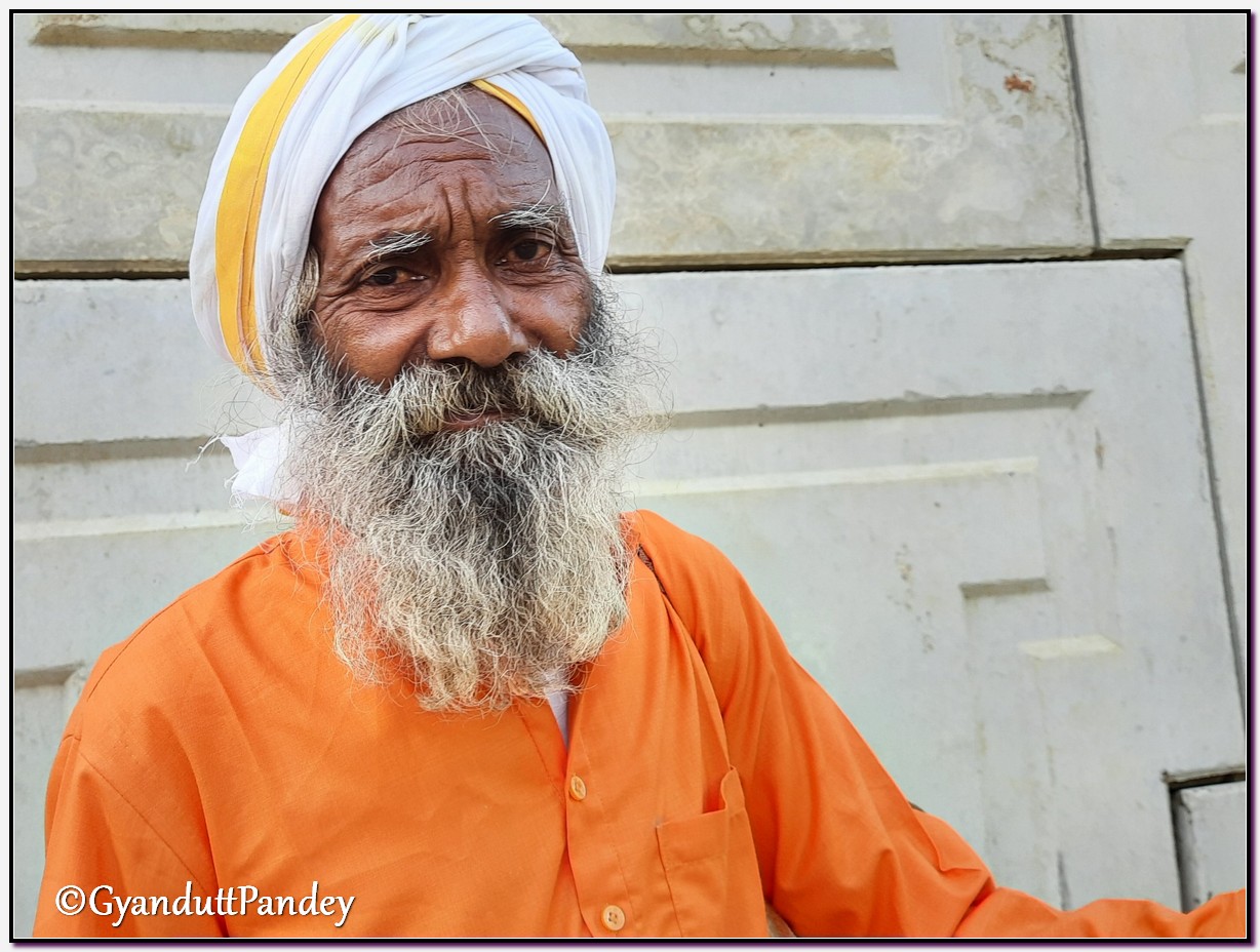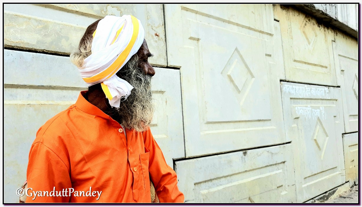 देखा – गेरुआ वस्त्र पहने थे। कुरता धोती (तहमद की तरह), सिर पर सफेद गमछा लपेटा था। पीछे लपेट कर कम्बल जैसा कुछ लिया था। बांये हाथ में एक झोला। कोई लाठी नहींं थी हाथ में। चाल तेज थी। आठ के.एम.पी.एच. वाली तो रही होगी। नंगे पांव, छरहरे और फुर्तीले थे वे साधू जी।