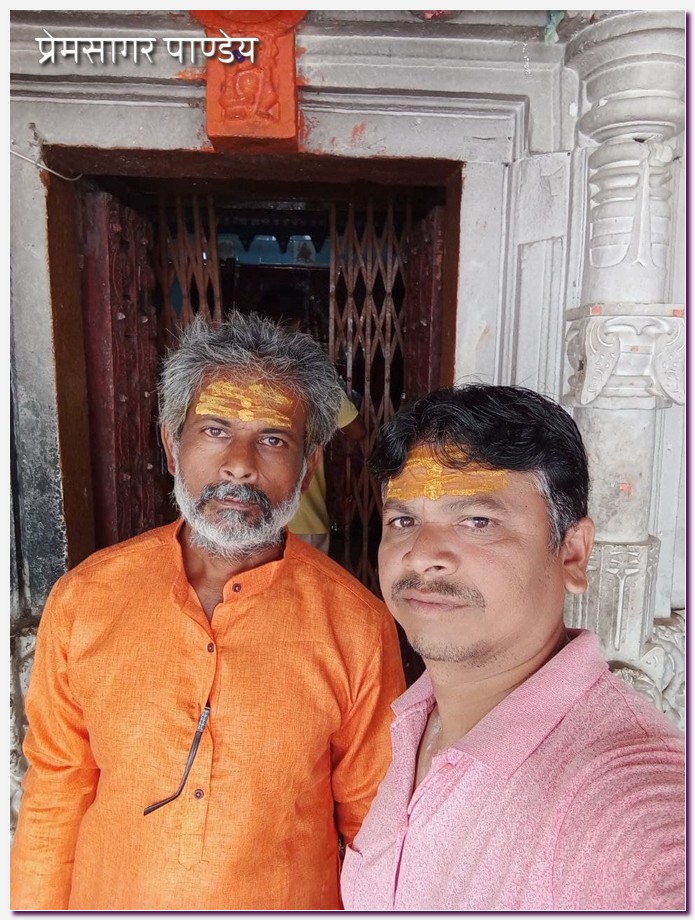 मंदिर परिसर में पण्डित दुर्गेश तारे और प्रेमसागर। नेपथ्य में ज्योतिर्लिंग है।