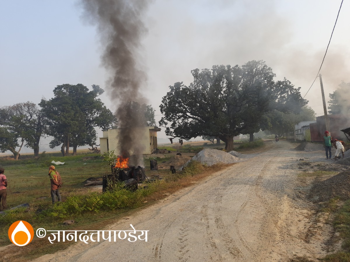 और देखा कि गांव की सड़कें जो योगी सरकार ने आते ही ठीक करवाई थीं, अब साढ़े चार साल में उधड़ गयी हैं। उनपर सवार हो कर वोट नहीं खींचे जा सकते। सो बारिश का मौसम बीतते ही वोट-खींचक यज्ञ (या मतदाता वशीकरण यज्ञ) प्रारम्भ कर दिया गया है। सड़क किनारे अलकतरा के ड्रम सीधे खड़े कर उन्हें गरम किया जा रहा है। मेरे सामने आग इतनी तेज लगी कि वस्तुत यज्ञ की अनुभूति हुई!