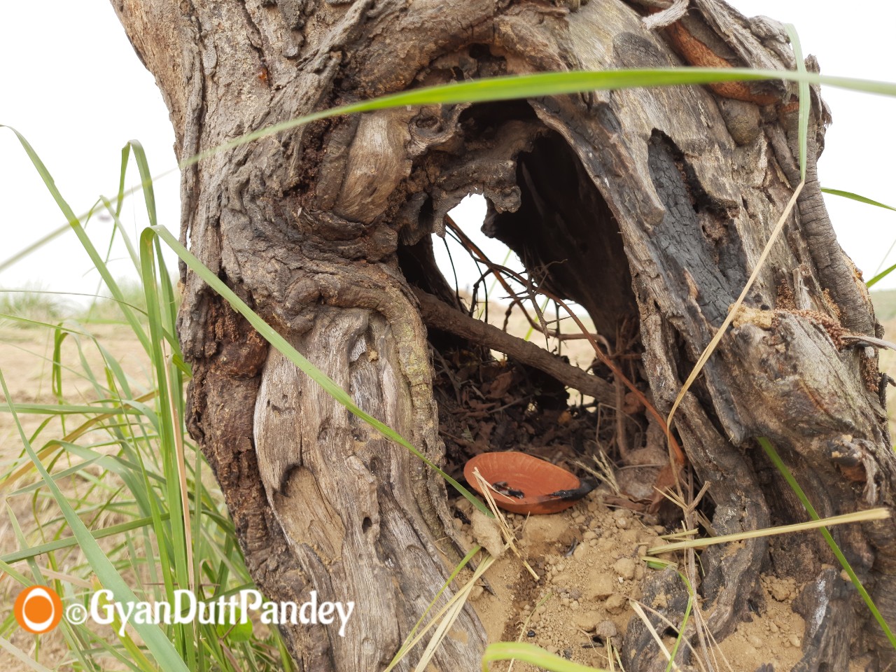 पास में ही शमी का वह वृक्ष है, जिसे कल मेरी पत्नीजी और मैंने अपने घर से लाये दियों को सजाने के लिये चुना था। उसके आसपास करीब चालीस पचास दिये सजाये थे। उनसे एक स्वास्तिक चिन्ह बनाया था। शमी में एक कोटर है। उसमें आरपार दिखता है। उस कोटर में भी एक दिया रखा था। आज सवेरे देखा तो सभी दिये वहां जस के तस थे। वह कोटर वाला दिया भी। दिन में कौव्वे उनसे छेड़छाड करेंगे।