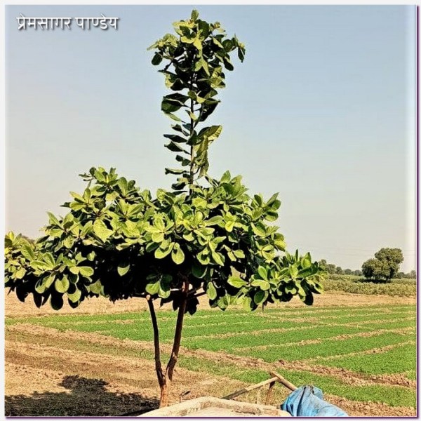 प्रेम कहते हैं कि वे अपनी कांवर हल्की कर लेंगे। कुछ कपड़े आदि कम करेंगे। किसी सुपात्र को दे देंगे। कांवर का वजन आधा कर चलते में सहूलियत रहेगी। वैसे भी यह धंधुका-राणपुर मार्ग ठीक ठाक है और आज गर्मी भी ज्यादा नहीं थी, इसलिये वे काफी चल पाये। रास्ते में एक बदाम के वृक्ष का चित्र भी लिया प्रेमसागर ने। बताया कि इस इलाके में बहुत से बदाम के वृक्ष हैं। बदाम यहां सस्ता मिलता है। दो सौ से पांच सौ रुपये किलो तक। वे एक दो किलो बदाम खरीद कर अपनी पोटली में रख लेंगे। मैंने उन्हे सुझाया कि सवेरे भीगे छिलका उतारे आठ दस बदाम खाया करें।
