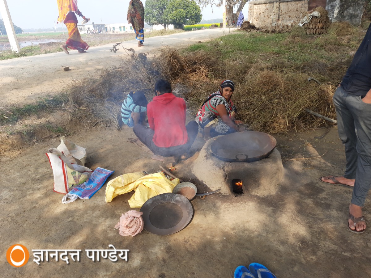 एक जगह सड़क किनारे भुंजईन और उसका लड़का भरसांय जला कर लोगों का चना लाई भून रहे थे। बताया कि संक्रांति के निमित्त हो रहा है वह। नये भुने चने की गंध से मन हुआ कि कुछ खरीद कर चबाया जाये; पर चूंकि वह बेचने के लिये नहीं, किसी ग्राहक के लिये था; मैंने अपने आप को मांग करने से रोका।