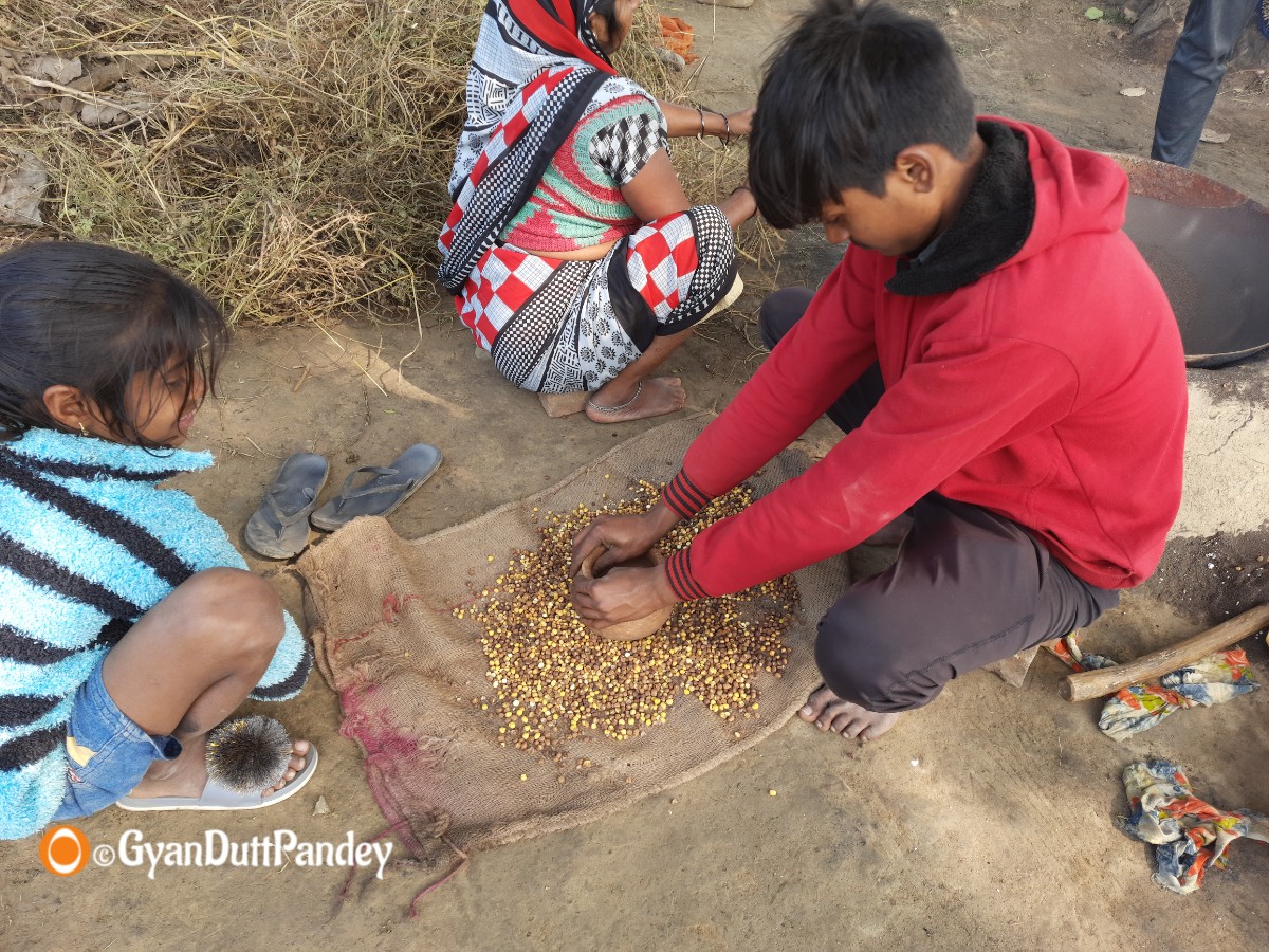 [एक जगह सड़क किनारे भुंजईन और उसका लड़का भरसांय जला कर लोगों का चना लाई भून रहे थे।]