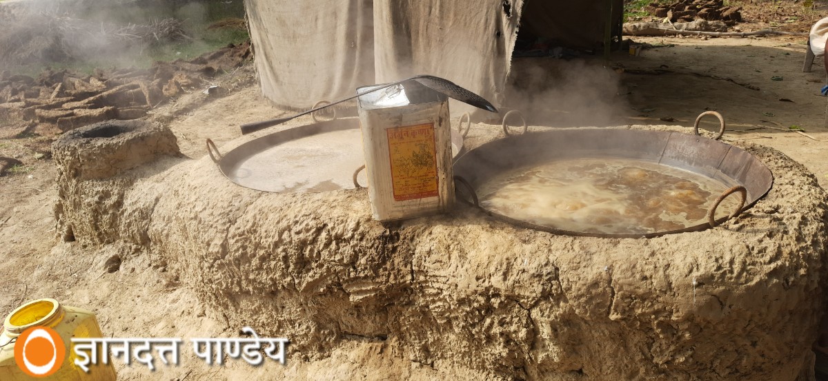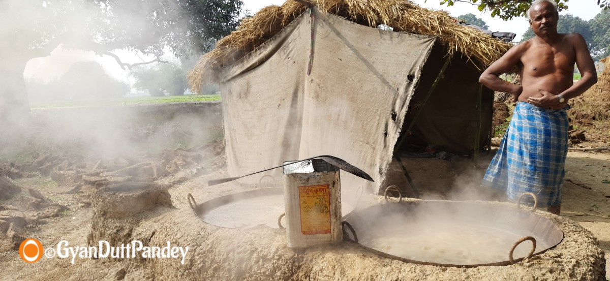 ऊंख की पेराई और गुड़ बनना चल रहा था। तीन जगह मुझे गुड़ के कड़ाहे चढ़े दिखे। गड़ौली के राजबली गुड़ बना रहे थे। उन्होने मुझे ऊंख देने और मशीन चला कर रस पिलाने की पेशकश भी की; पर मैंने मधुमेह का बहाना बना कर अपने को ‘रेस्क्यू’ कर लिया। सर्दी के मौसम में मैं तीन लेयर कपड़े डाटे हुये था, पर राजबली उघार बदन थे। दोपहर का समय और गुड़ के चूल्हे-कड़ाहे की गर्मी और शायद उम्र के अंतर में वैसा हुआ जा सकता था। मैंने उनसे गुड़ बनाने के सिस्टम और उसकी लागत पर चर्चा की। उन्होने मुझसे मेरे कामधाम के बारे में पूछा। रेलवे से रिटायर जान कर उन्होने कयास लगाया – आप तो बड़े बाबू (चीफ क्लर्क?) रहे होंगे।