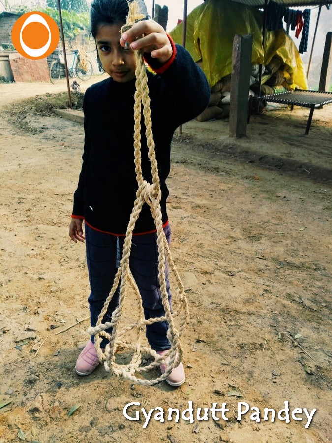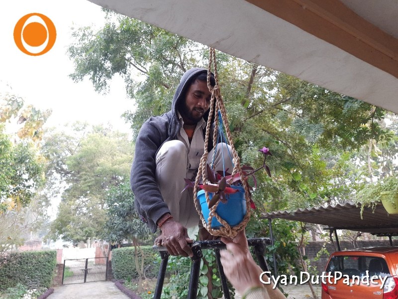 पलाश की रस्सी से बुने सीखर से गमला टांगता मेरा वाहन चालक गुलाब चंद
