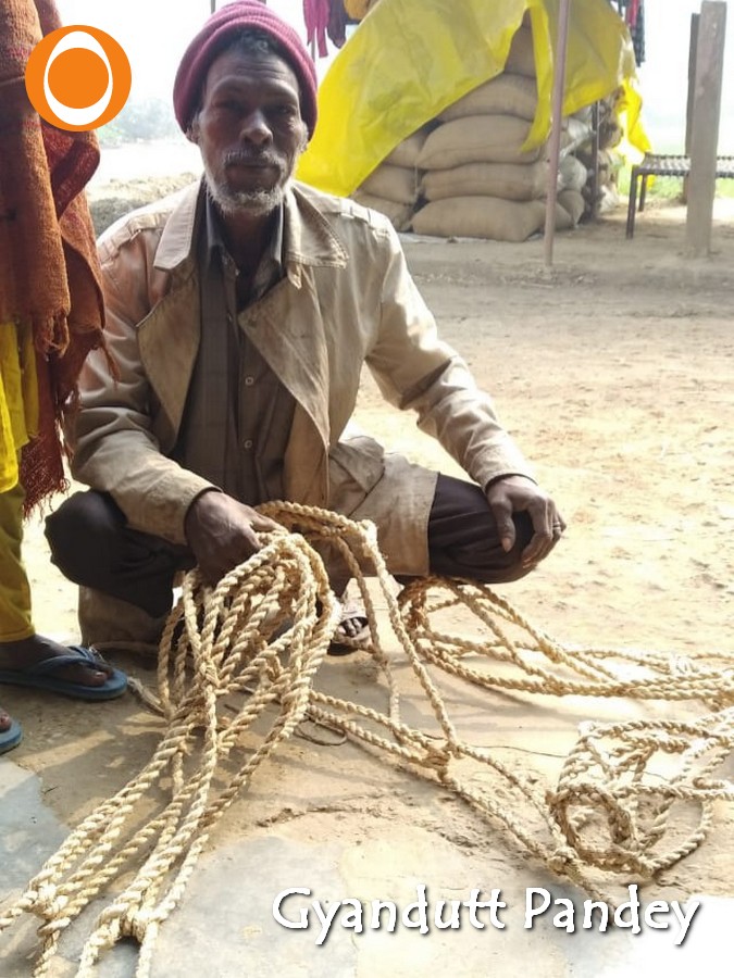 चिन्ना पांड़े, पलाश की जड़ के रेशे की रस्सी से बनी बकेल दिखाते हुये।
