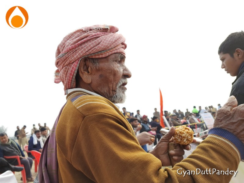 संक्रांति पर समारोह में गुड़ का लड्डू रखा गया है ट्रे में। निमंत्रित लोग खा रहे हैं। एक सहृदय वालेण्टियर उसे भी एक लड्डू दे देता है। एक हाथ में लड्डू ले कर वह तुरंत दूसरा आगे करता है – “एक ठे अऊर दई द। हमार बूढा बा संघे (एक और देदो, मेरी पत्नी भी साथ में है)।”