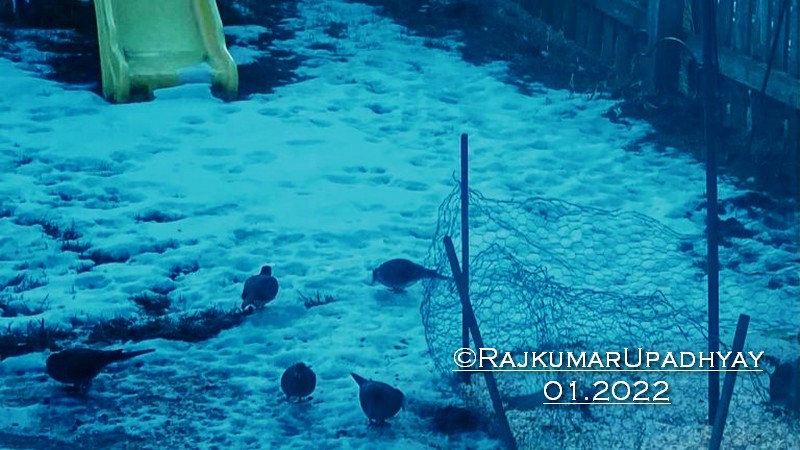 एक साल यहां कोहरे के मौसम में तीन चार दिन तक कोई पक्षी या गिलहरी दिखे नहीं थे। पर राजकुमार जी ने चित्र भेजे हैं जिसमें सवेरे -2डिग्री तापमान की बर्फ में भी चिड़ियाँ दाना चुगने आ गयी हैं और गिलहरी उन्हें भगा रही है। मौसम और जंतुओं की अलग अलग तासीर है। वहां की गिलहरी और कबूतर यहां के 42डिग्री की गर्मी में शायद टें बोल जायें। यहां के जंतु वहां के -6डिग्री में स्वर्गवासी हो जायें।