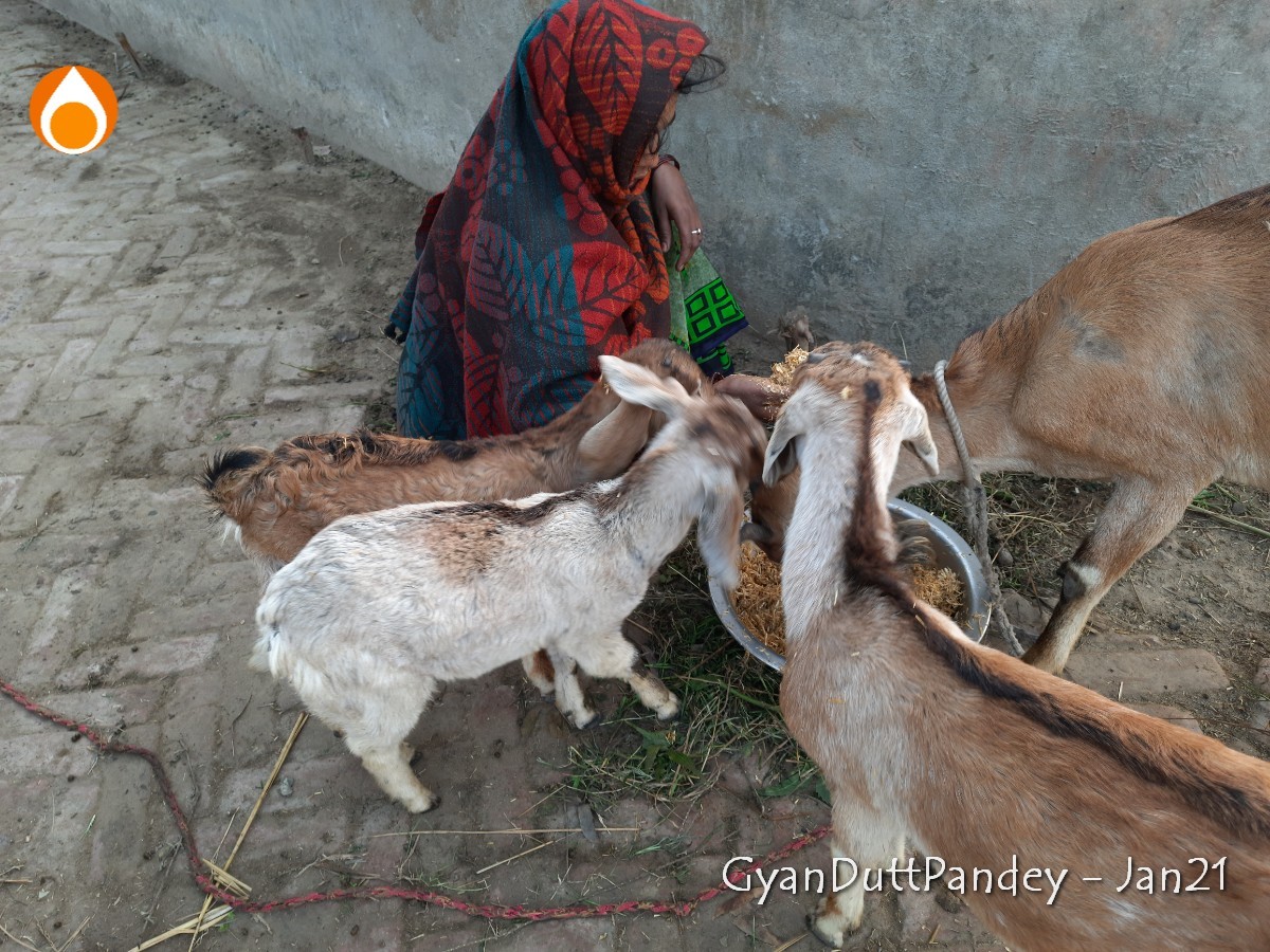 बीस पचीस कदम चलते ही कऊड़ा के आसपास बैठे लोग दिखते हैं। अभी काम पर लगने का समय नहीं हुआ है। या स्त्रियां काम कर रही हैं पर आदमी और बच्चे अलाव की गर्माहट ले रहे हैं अभी भी। ये लोग गांव की अर्थव्यवस्था में सबसे कमजोर पायदान पर नहीं हैं। इनके पास खेती की जमीनें नहीं हैं, पर घर बनाने के लिये जरूर जगह है। एक एक दो दो कमरे के घर हैंं; साथ में मड़ई या टप्पर है जिसमें बकरियां, मुर्गियां, गायें भैंसें रहती हैं। ज्यादातर के पास बकरियां हैं। सर्दी से बचाने के लिये उनपर पुराना कपड़ा या टाट का बोरा डाला हुआ है। एक नांद या तसले में भूसा-पुआल बारीक काट कर डाला है जिसे बकरियां खा रही हैं।