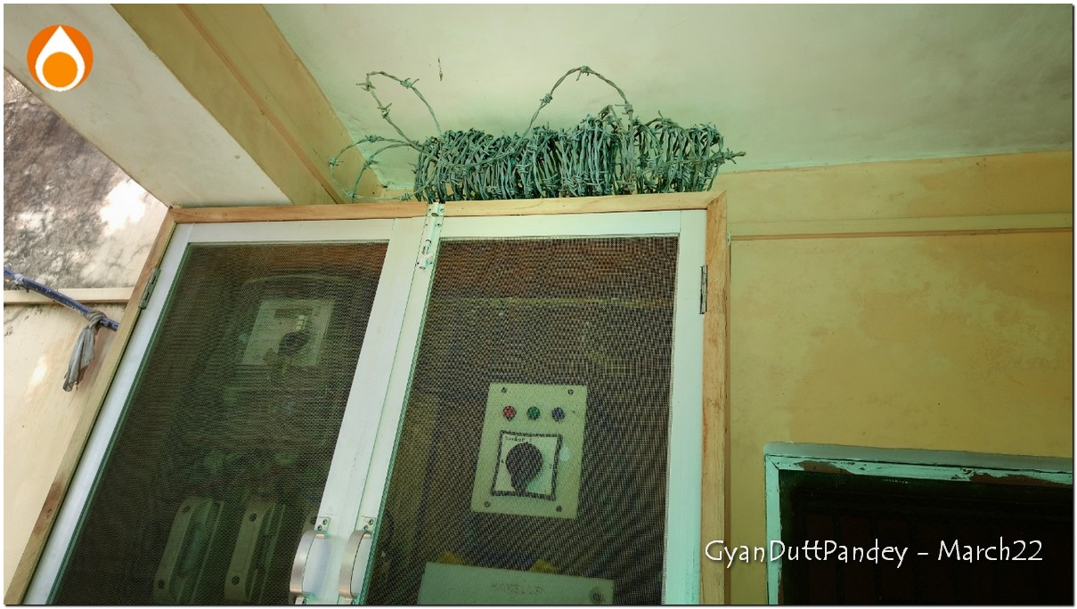 फैंसिंग के लिये मंगाये कंटीले तार का एक बण्डल बचा रखा है। उस बंडल को खोज कर निकाला गया और उस जगह पर, जहां कबूतर बैठते हैं, अड़ा दिया।