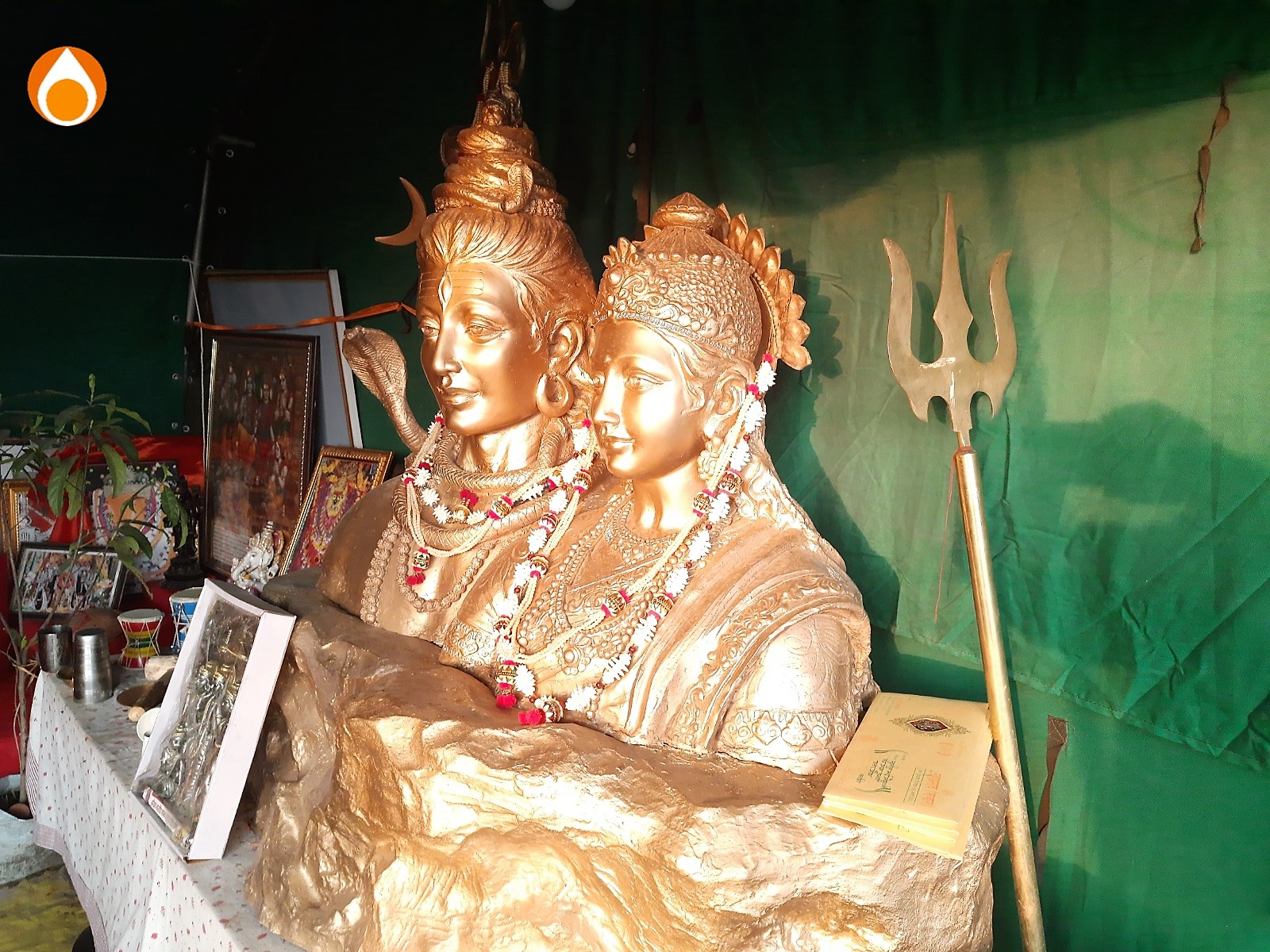 महुआ के तने पर लिखा बोर्ड है – अन्नपुर्णा मंदिर। वह बोर्ड एक टेण्ट को इंगित करता है, जिसके लिये सुनील ओझा जी ने गड़ौलीधाम के ब्रोशर में लिखा है कि सेना के उसी टेण्ट से गड़ौली धाम की शुरुआत हुई थी। उसी टेण्ट में पूरब की ओर देवी देवताओं के चित्र रखे हैं। गौरीशंकर की जो विशाल प्रतिमा परिसर में गंगा किनारे लगने जा रही है, उसकी प्रतिकृति भी वहां है। मैंने आगंतुक लोगों को आगमन पर पहले वहां चप्पल-जूता उतार कर गौरीशंकर और अन्य देवी देवताओं को नमन करते देखा है। इस परिसर में आने वाला हर सामान्य-विशिष्ठ व्यक्ति अन्नपूर्णा माँ को धोक देता है।