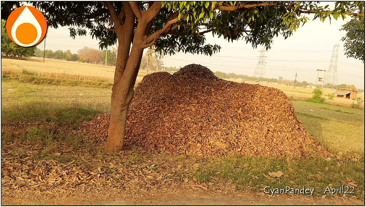 पत्ते बहुत झरे। नये आ गये हैं। पर अभी भी कुछ झर ही रहे हैं। सर्दी के मौसम में बच्चे कऊड़ा/अलाव के लिये दिन भर बीनते थे। अब वे नजर नहीं आते। अब बहुत मात्रा में पत्ते हैं तो कंहार लोग, जिनका पुश्तैनी धंधा भुंजवा (भरसायंंमें दाना भूनने) का है; वे पत्तियां इकठ्ठा कर रहे हैं। झाल में पत्तियां ले जाते और कहीं कहीं पत्तियों के ढेर लगे दीखते हैं।