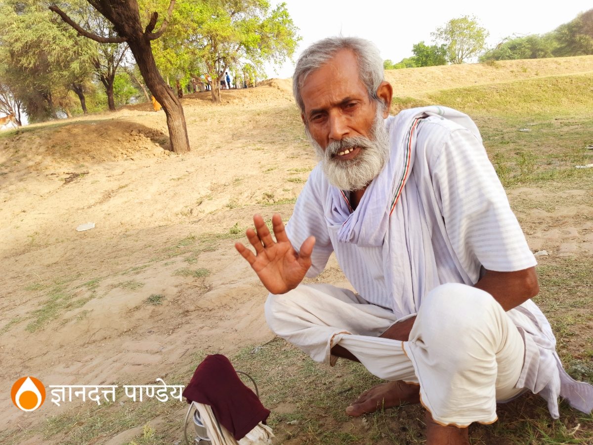 बातचीत होने लगी तो हम दोनो रास्ते में ही बैठ गये। लोग आसपास से जाते आते रहे गंगा तट पर। प्रेमचंद ने बताया कि सन 1998 से वे नियमित हैं गंगा स्नान में। उम्र सत्तर साल की हो गयी है। बुनकर हैं। धर्म की ओर रुचि शुरू से ही है। एक हनुमान जी को पूजने वाले मिले थे। उनकी संगत में रहे। लेकिन लगा कि ब्रह्मा विष्णु महेश सम्पदा-धन का वरदान तो देंगे, पर मोक्ष का वरदान नहीं। वे अपने एक ट्रांस के अनुभव को बताने लगे – “सवेरे की रात थी। नींद में मुझे लगा कि त्रिशूल गड़ा है – धरती से आसमान तक। त्रिशूल के ऊपरी भाग पर डमरू लटका है और पास में शिवजी आसन लगा कर ध्यानमग्न हैं। विष्णु भगवान और ब्रह्माजी भी आसपास हैं। वे वरदान देने की बात करते हैं पर धन दौलत की बात करते हैं। मेरे मोक्ष की बात कहने पर कोई साफ उत्तर नहीं देते।”