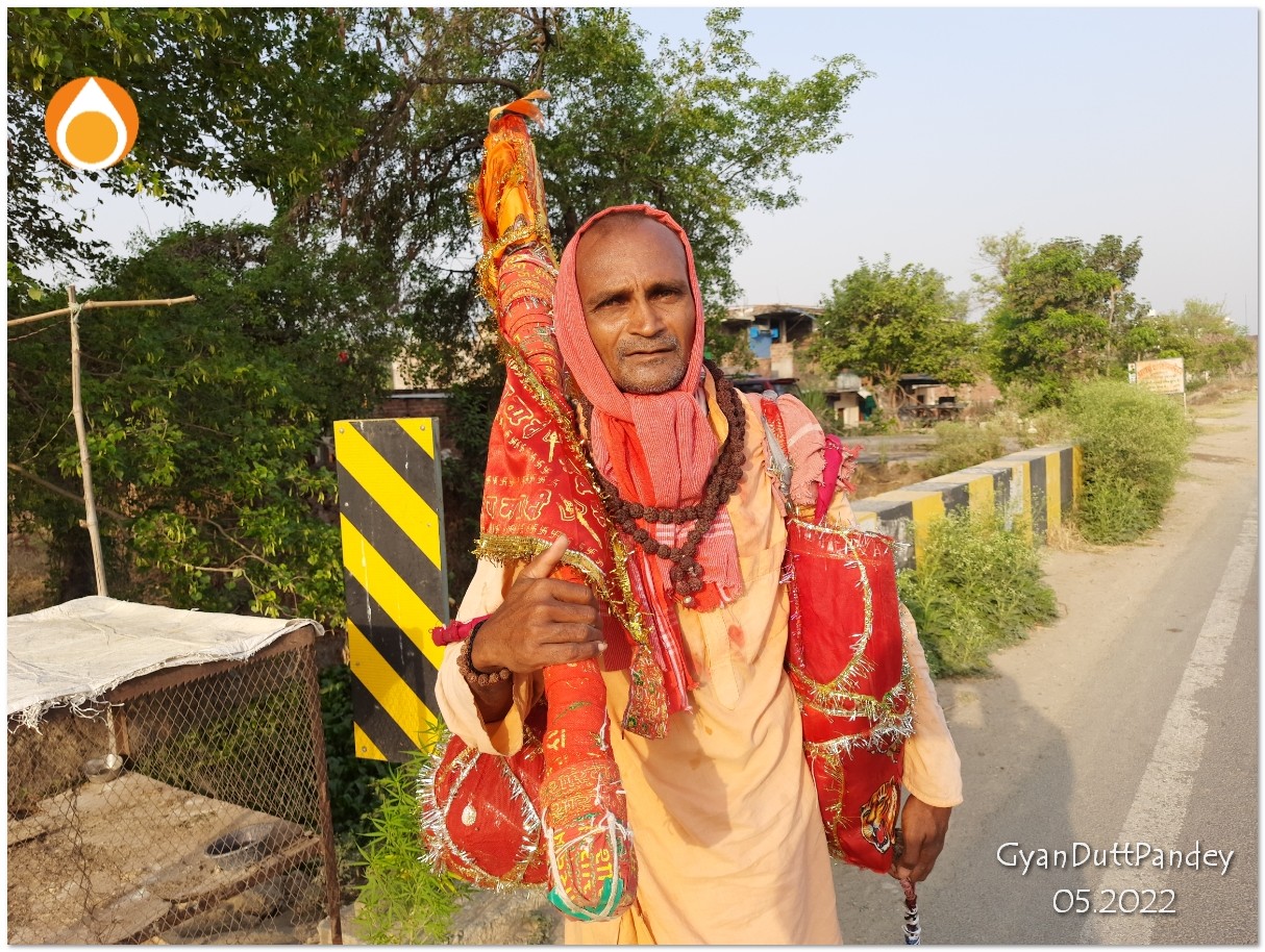 आज राघवेंद्र दास मिले। बीजापुर, कर्णाटक से दो झोला और एक बोतल पानी लिये हवाई चप्पल पहने चले आ रहे हैं। गेरुआ वस्त्र पहने; हल्का सा तिलक। इकहरा बदन। थोड़ा सांवला रंग। सिर पर गमछे का स्कार्फ। कन्नड पुट लिये हिंदी। बताया कि बीजापुर के इंडी तहसील के जेवुर गांव के हैं। वहां से चल कर रायचूर के पास से नेशनल हाईवे 8 पकड़ कर वाराणसी चले आये। अब बनारस से निकले हैं – मथुरा-वृन्दावन जायेंगे। उसके आगे जहां भगवान ले जायें! – वे ऊपर आसमान की ओर हाथ कर बोलते हैं कि सब ईश्वर आधीन है। उनकी पदयात्रा ईश्वर आधीन है।