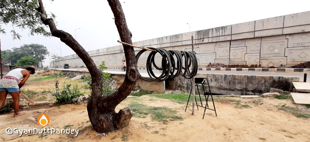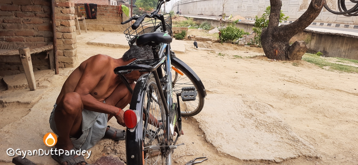 गांव में दो दुकानें हैं साइकिल रिपेयर की। दोनो के मुखिया का नाम जोखन है। दोनो जोखनों को चीन्हने के लिये जोखन-पूर्व और जोखन-पश्चिम कहा जा सकता है। जोखन पूर्व शिवाला पर भी ब्रांच खोले हैं। कौन दुकान ज्यादा चलती है? इसका उत्तर देना कठिन है। दोनो जोखन यह कहते हैं – “बस, पेट पालने भर को मिलता है।” और सच में लगता भी है कि पेट पालने भर को मिलता है। साइकिल वाले ही नहीं; पूरे गांव भर में चार पांच परिवारों को छोड़ कर सब का यही हाल है। पेट पालने भर को मिलता है।