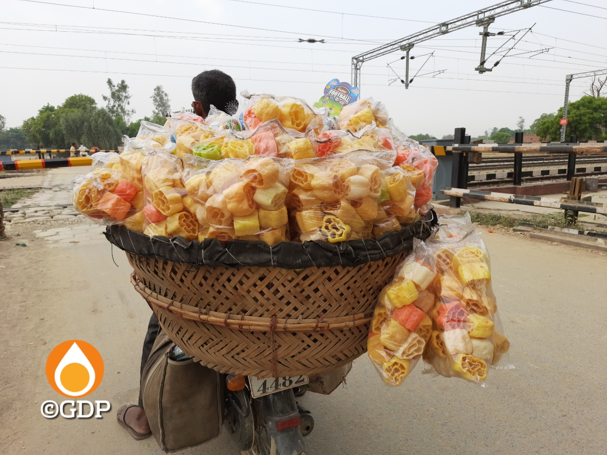 समय गुजारने के लिये मैंने चित्र लेने शुरू कर दिये। उस मॉपेड वाले से बात करनी भी प्रारम्भ की। खांची में और थैलों में वह काफी सामान लिये था। गांव में जो बिक सकता है – टॉफी, चूरन, पूपली और कंफेक्शनरी के बहुत से आईटम। किण्डर ज्वॉय – जो बच्चों को बहुत प्रिय है और तीस चालीस रुपये का आता है (वह मध्यम वर्ग के बच्चे ही खाते होंगे) का डूप्लीकेट का एक पैकेट भी था जिसपर लिखा था – मिस्टर फन बनी। चोको बीन्स। उसने बताया कि वह पांच रुपये का मिलता है मार्केट में। पूपली – चावल की तली कुरकुरी नमकीन जो एक पाइप के आकार की होती है; की बजाय चौड़ी और कई छेदों वाली लाल और पीले रंग की मिली जुली पूपलियों के कई पैकेट थे। एक पैकेट बीस रुपये का। खुदरा में दो रुपये का एक बेचते होंगे दुकानदार। उसका नाम फेरीवाले ने बताया – “लोग चिप्स कहते हैं पर हम उसे भिण्डा कहते हैं। कटी भिण्डी जैसा दिखता है।”