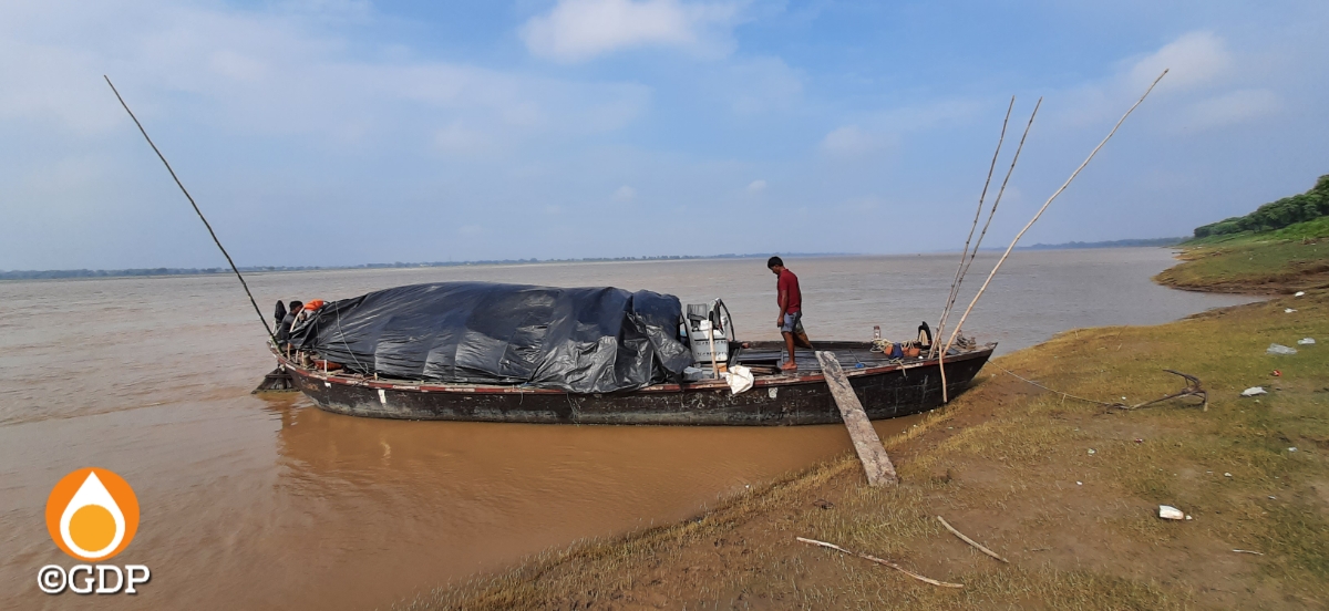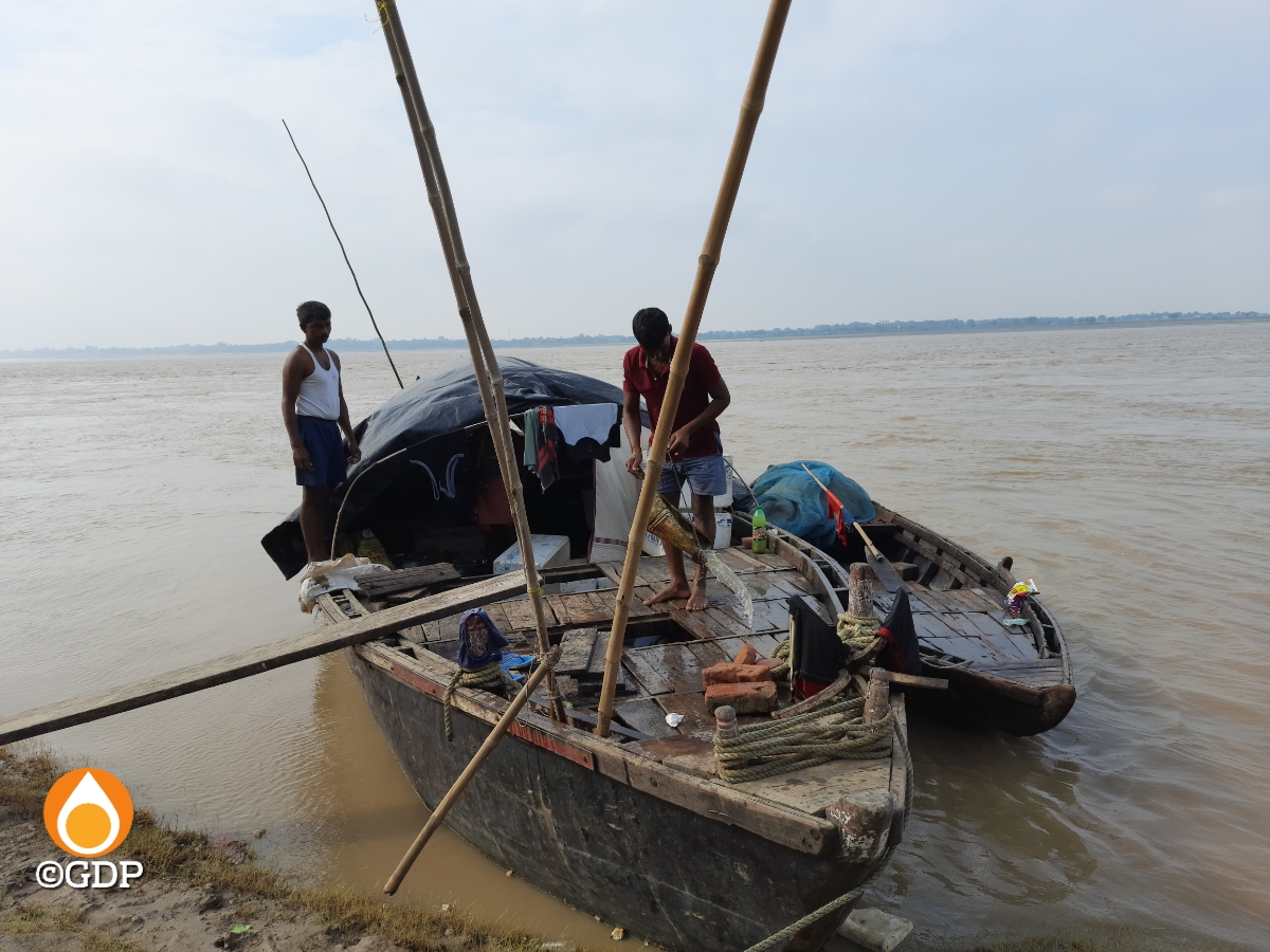 बड़ी नाव किनारे लगी थी। बालू ढोने वाली नहीं थी। उसका दो तिहाई रिहायशी था – तिरपाल से ढंका हुआ। उसके बगल में एक छोटी डोंगी भी थी। दोनो नावें मछली मारने के लिये निकली थीं।