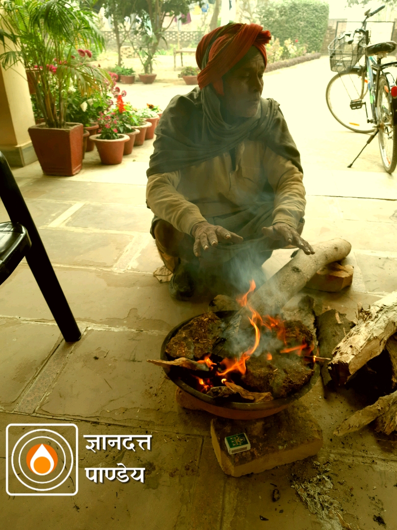 सवेरे सवेरे ढूंढी आये। अशोक कऊड़ा जला चुका था। पहले उन्होने पास बैठ शरीर गर्म किया। उन्होने मुझसे मिलने की बात कही तो अशोक ने मुझे खबर दी। बाहर निकल कर उनसे मिला। उन्होने पैलगी की। उसके बाद अपने आने की मंशा – “जीजा, कोटेदार कहेस कि आपके लगे गोंहू होये। (जीजा कोटेदार – राशन बांटने वाला मुलाजिम – ने कहा है कि आपके यहां गेंहू मिल सकता है।)”