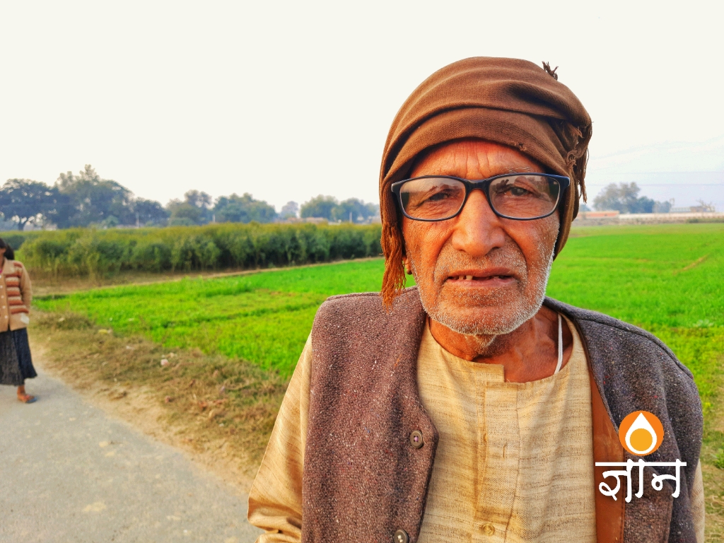 मैं पास के गांव भगवानपुर तक साइकिल चला रहा था। कई चक्कर लगा चुका था। तभी वे लाठी टेकते भगवान पुर की ओर जाते दिखे। मैंने पीछे से उनका चित्र लिया नोकिया के 3111 मोबाइल से; और उनसे आगे निकल गया। मेरे वापस लौटने तक वे कुछ ही कदम चले होंगे। सामने से उनका चित्र लेते समय उन्होने मुझे रोक लिया।