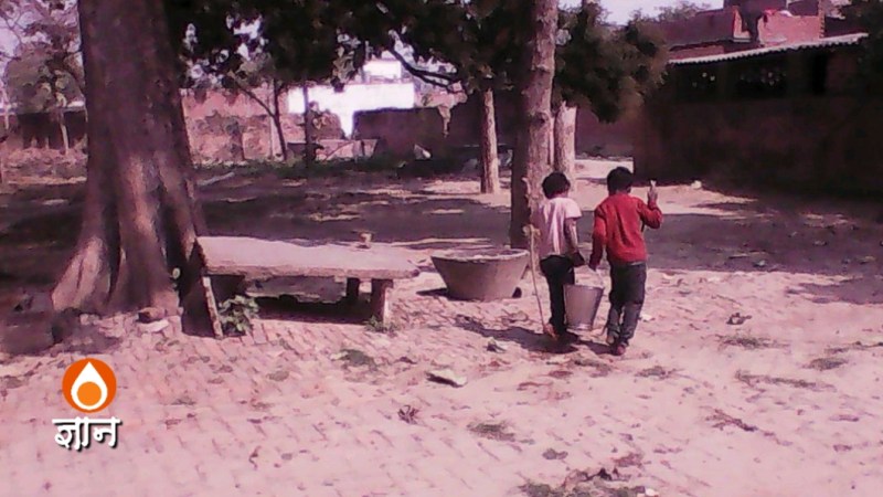 अब सरकार कहती है कि हर घर तक नल से पानी की सप्लाई होगी। फिलहाल तो ये बच्चे बीस-पच्चीस मीटर पानी उठा कर ले कर जाते दीखते ही हैं। कहीं कहीं इससे ज्यादा भी दूरी होती होगी। अगर गांव के लोग सरकार के दिये चांपाकल को अपनी व्यक्तिगत सम्पत्ति न मानें और किसी को भी अपने घर के बाहर के चांपाकल से बिना हील-हुज्जत पानी लेने दें तो यह दूरी घट कर दस कदम पर आ सकती है। उत्तर प्रदेश के गांवों में आबादी सघन है और सरकार की दी गयी सार्वजनिक सेवायें बहुत हैं। समस्या गांव वालों की संकुचित प्रवृत्ति ही है।