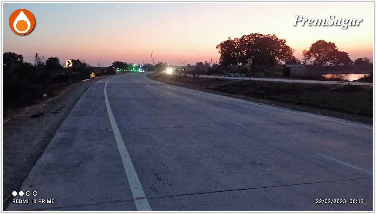 आज वे सवेरे सवा पांच-साढ़े पांच बजे के बीच अमरपाटन में वन विभाग की नर्सरी के कर्मी तिवारी जी के घर से रवाना हुये। सवा छ बजे के चित्र हैं जिनमें हाईवे के क्षितिज पर उषा की लालिमा है। वाहनों और घरों की जलती लाइटें हैं। चाय की दुकान वाले का फोटो है जिसमें पान मसाला के लटकते हुये पाउच भी हैं। एक अन्य दृष्य में सड़क किनारे अलाव जलाये दो लोग भी हैं। ये तीनों चित्र सवेरे का वातावरण बखूबी कैच करते हैं। प्रेमसागर जानते हैं कि मुझे यही चाहियें। वे यह भेज कर बात प्रारम्भ करते हैं।