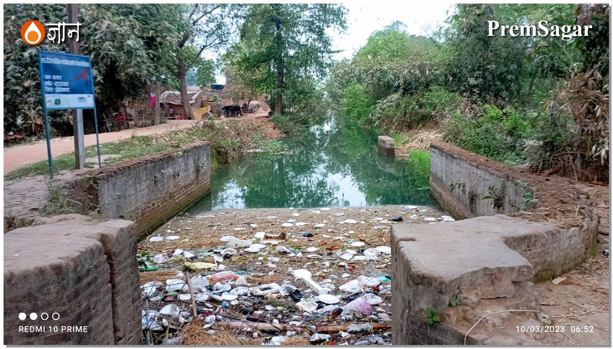 दाऊदनगर के किनारे ग्रामीण इलाके में प्लास्टिक से नहर के जल का प्रदूषण नजर आ गया। मेरे ख्याल से प्रेमसागर ने यह जानबूझ कर नहीं खींचा होगा। पर यह बयान करता है कि इस कचरे के माध्यम से खेत की सिंचाई और उससे उपज का चना-सरसों-धान-गेंहू, सब प्रदूषित हो रहा है। प्लास्टिक और थर्मोकोल का प्रयोग बंद भी हो जाये तो भी जीवों की कोशिकाओं में हजारों साल बाद भी प्लास्टिक के सूक्ष्म कण गुणसूत्रों में समाये मिलेंगे।