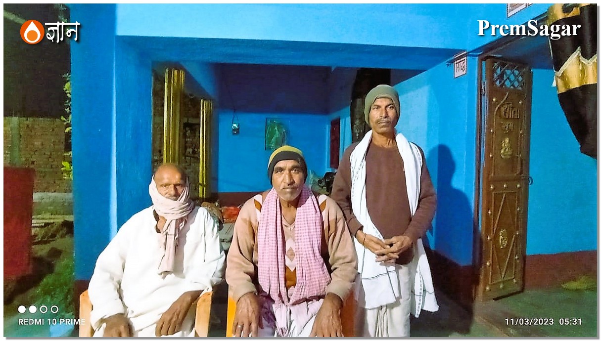 खड़े हैं प्रमोद कुमार सिंह। बीच में मुखिया जी। बांये वाले सज्जन रात में प्रेमसागर जी के पास ही जमीन पर बिस्तर लगा कर सोये। “बाबाजी को अकेला नहीं छोड़ सकते”।