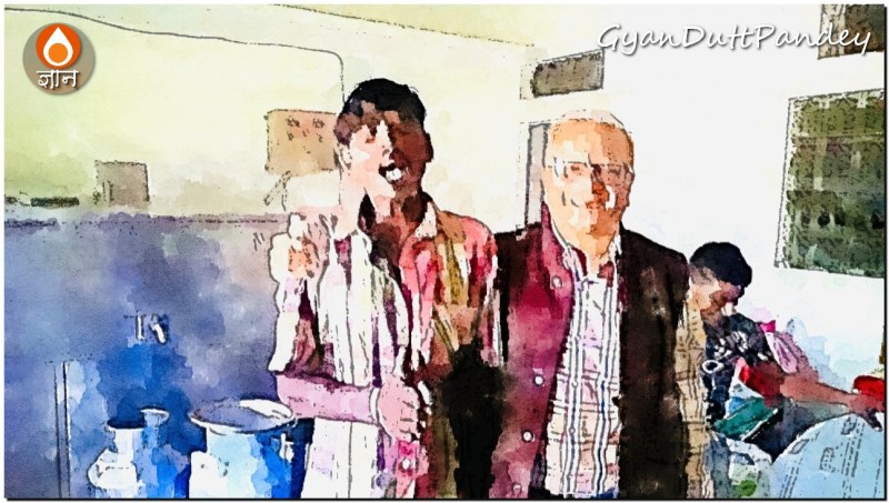 सवेरे मडैयाँ डेयरी का दृश्य। दूध के बाल्टों, ड्रम तथा दूध देने आये किसानों से भरी जगह के बीच छोटे से स्पेस में वह उछल कर, आगे कूद कर, हाथ लहरा कर, नमस्कार कर और मेरे बारे में पता चलने पर मुझे बार बार चरण छूने का प्रयास कर जो कुछ कर रहा था, वह बहुत रोचक था। डेयरी के उस दूध कलेक्शन सेण्टर पर उजाला बहुत ज्यादा नहीं था। चित्र बहुत साफ नहीं आये। एक छोटे वीडियो में उसकी आकृति भी धुंधली है। पर उसका चरित्र बहुरंगी था।