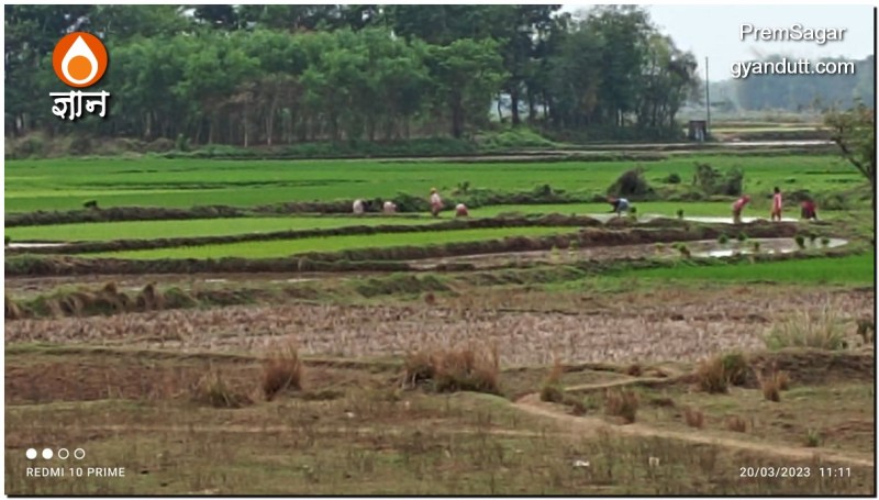 प्रेमसागर ने रास्ते में धान की रुपाई करते किसान-श्रमिक देखे।