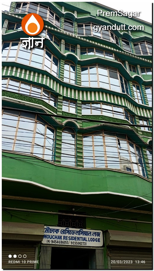 मौचक लॉज और लड्डू शाह जी का धुंधला चित्र। इस लॉज में प्रेमसागर अगले कुछ दिन रुकने की सोच रहे हैं।